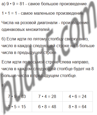 а) Какое произведение в таблице умножения самое большое, самое маленькое? Что интересного в числах, расположенных на розовой диагонали?