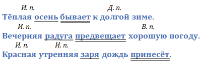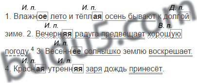 1. Влажн... лето и тёпл... осень бывают к долгой зиме. 2. Вечери... радуга предвещает хорошую погоду.4 3. Весенн... солнышко землю воскрешает. 4. Красн... утренн... заря дождь принесёт.