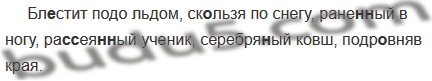 Бл..стит подо льдом, ск..льзя по снегу, ране (н,нн)ый в ногу, ра(с, сс)ея(н, нн)ый ученик, серебря(н,нн)ый ковш, подр..вняв края.