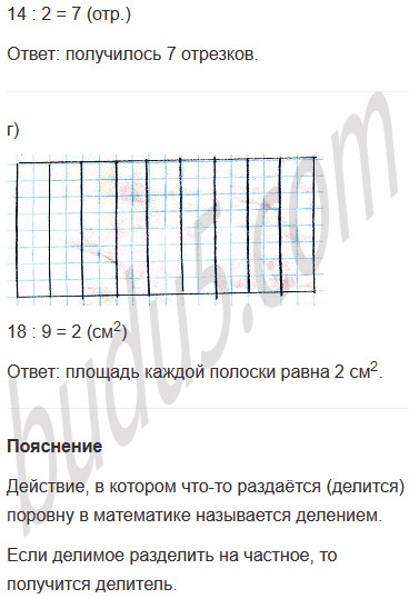 в) Отрезок длиной 14 см разделили на равные отрезки по 2 см в каждом. Сколько получилось отрезков?