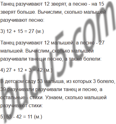 б) В детском саду страны фантазёров 25 динозавриков и 28 абракадабриков. Трое малышей болеют, а остальные готовятся к утреннику, причём каждый из них занят одним делом. Танец разучивают 12 зверят, песню - на 15 зверят больше, а остальные учат стихи. Сколько малышей разучивают стихи?