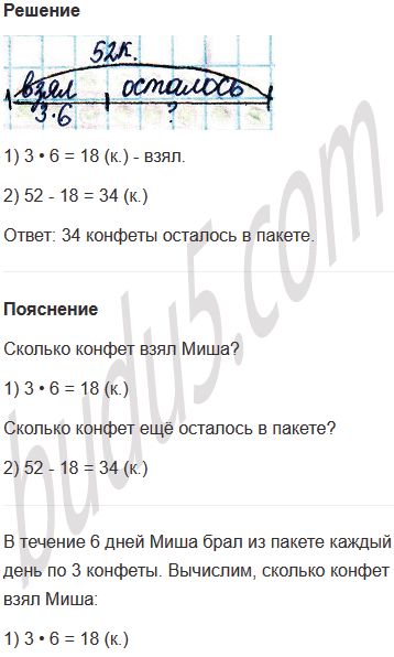 Задание № 9. В пакете было 52 конфеты. В течение 6 дней Миша брал из пакета каждый день по 3 конфеты. Сколько конфет ещё осталось в пакете?