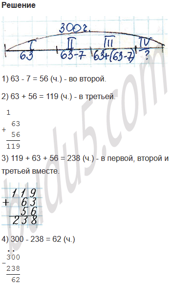 Задание № 13. В эстафете приняла участие команды четырёх школ. В первой команде было 63 человека, во второй - на 7 человек меньше, чем в первой, а в третьей - столько, сколько в первой и во второй командах вместе. Сколько человек было в четвёртой команде, если всего в этой эстафете приняла участие 300 человек?