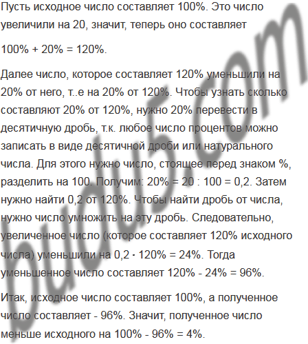 Некоторое число сначала увеличили на 20%, а потом уменьшили результат на 20%. Установите, больше или меньше исходного полученное число и на сколько процентов.