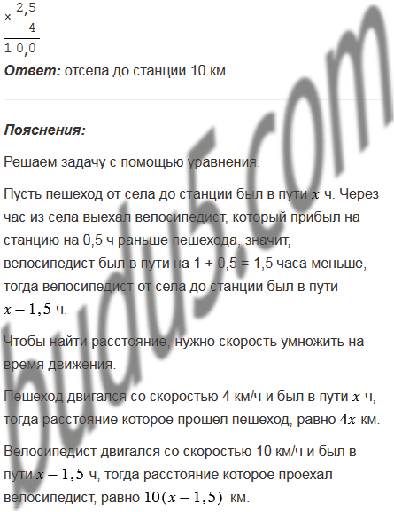 Из села в направлении станции вышел пешеход со скоростью 4 км/ч. Через час из села со скоростью 10 км/ч выехал велосипедист, который прибыл на станцию на 0,5 ч раньше пешехода. Какое расстояние от села до станции?