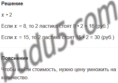 Задание № 11. Ластик стоит х руб. Сколько стоят 2 ластика? Составь выражение и найди его значение для х = 8, х = 15.