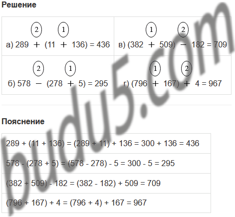 | а) 289 + (11 + 136) | в) (382 + 509) - 182 |