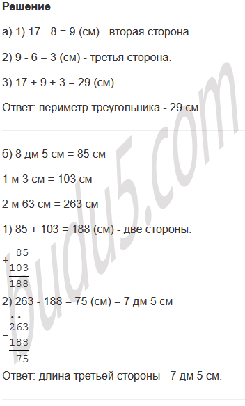 б) Первая сторона треугольника равна 8 дм 5 см, а вторая сторона - 1 м 3 см. Найди его третью сторону, если периметр треугольника равен 2 м 63 см.