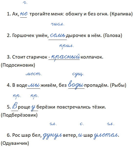 Поработайте в парах: прочитайте. Догадайтесь, какие слова в загадках пропущены. Впишите их. Укажите, какой частью речи является каждое из этих слов.