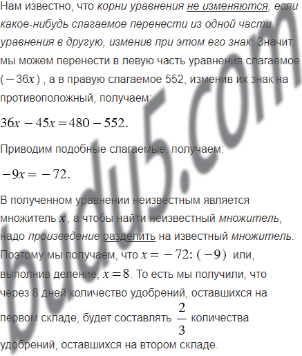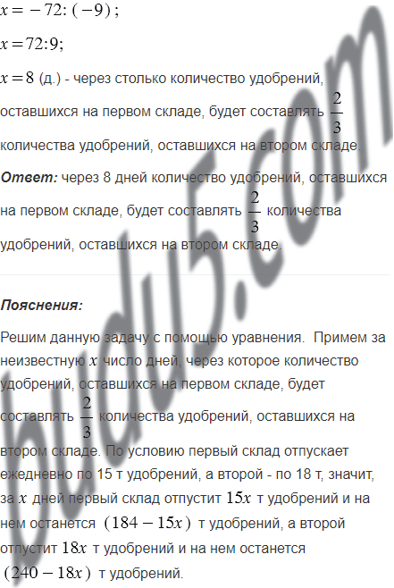 На одном складе было 184 т минеральных удобрений, а на втором - 240 т. Первый склад отпускает ежедневно по 15 т удобрений, а второй - по 18 т. Через сколько дней количество удобрений, оставшихся на первом складе, будет составлять