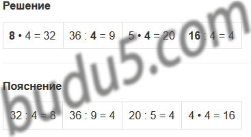 | а • 4 = 32 | 36 : b = 9 | 5 • k = 20 | t : 4 = 4 |