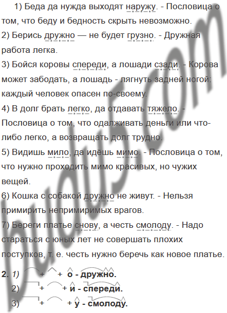1) Беда да нужда выходят наружу. 2) Берись дружно — не будет грузно. 3) Бойся коровы спереди, а лошади сзади. 4) В долг брать легко, да отдавать тяжело. 5) Видишь мило, да идёшь мимо. 6) Кошка с собакой дружно не живут. 7) Береги платье снову, а честь смолоду.