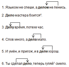 Дело (И. п.) мастера боится. Языком не спеши, а делом (Т. п.) не ленись. Делу (Д. п.) время, потехе час. Слов много, а дел (Р. п.) мало. И умён, и пригож, и в деле (П. п.) хорош. Ты сделал дело (В. п.), теперь гуляй смело.