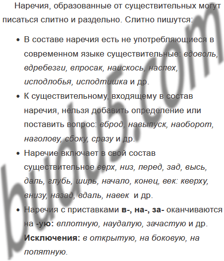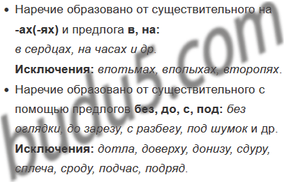 | Наречие образовано от существительного с приставкой пол- и предлога в: вполсилы, вполоборота, вполнакала и др. | Наречие образовано от существительного с помощью предлогов без, до, с, под: без оглядки, до зарезу, с разбегу, под шумок и др. Исключения: дотла, доверху, донизу, сдуру, сплеча, сроду, подчас, подряд. |