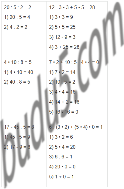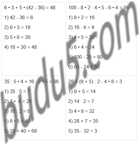 | 35 : 5 • 4 + 16 : 2 • 5 | 28 + (9 + 5) : 2 - 4 • 8 |