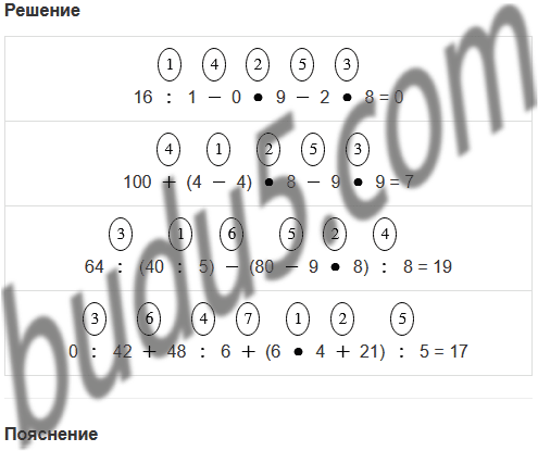 | 100 + (4 - 4) • 8 - 9 • 9 | 0 : 42 + 48 : 6 + (6 • 4 + 21) : 5 |