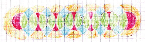 13. Отметь на клетчатой бумаге 7 точек в ряд через каждые 2 см. Проведи окружности с центрами в данных точках, радиусы которых равны 1 см и 2 см. Раскрась получившийся узор.