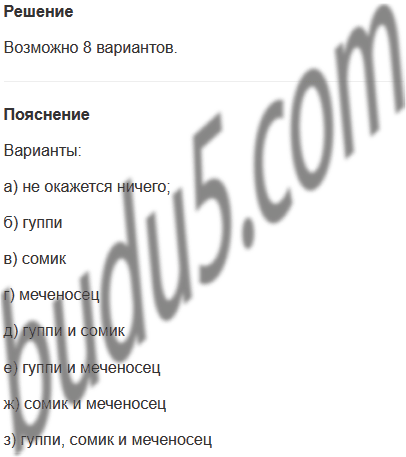 Задание № 16. В аквариуме 3 рыбки: гуппи, сомик и меченосец. Толя запустил в аквариум сачок. Что может в нём оказаться? Перечисли все возможные варианты.