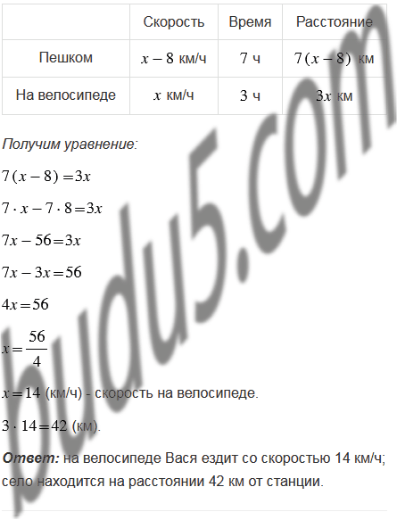 От села до станции Вася может доехать на велосипеде за 3 ч, а дойти пешком - за 7 ч. Скорость пешком на 8 км/ч меньше, чем скорость движения на велосипеде. С какой скоростью ездит Вася на велосипеде? На каком расстоянии находится село от станции?