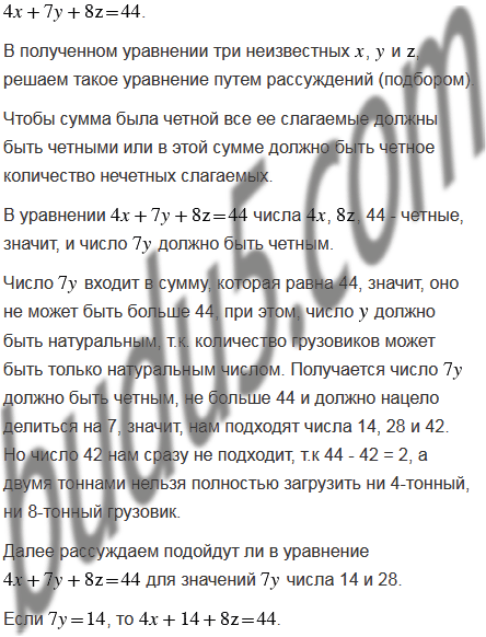 Для перевозки груза выделили 4-, 7- и 8-тонные грузовики. Каждый автомобиль должен сделать только одну ходку. Сколько требуется грузовиков каждого вида для перевозки 44 т груза?