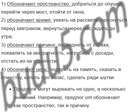 Определите, какие значения выражают предлоги. Распределите словосочетания по группам в зависимости от значений предлогов: 1) обозначают пространство; 2) обозначают время; 3) обозначают причину; 4) обозначают цель.