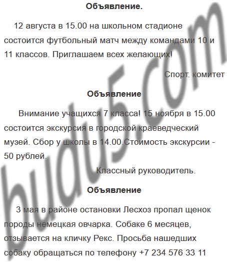 Напишите текст объявления: 1) о проведении футбольного матча; 2) об экскурсии; 3) о пропаже щенка.