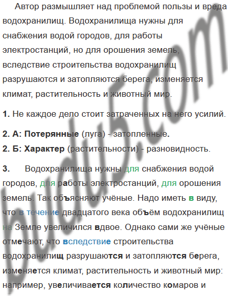 Водохранилища нужны для снабжения водой городов для р..боты электростанций для орошения земель. Так об(?)ясняют учёные. Надо иметь (в)виду, что (в)течени.. XX века об(?)ём водохранилищ на Земле увеличился (в)двое. Однако сами же учёные3 отм..чают, что (в)следстви.. строительства водохранилищ(?) разрушают(?)ся и затопляют(?)ся б..рега изм..ня..тся климат растительность и животный мир: например, ув..личива..т(?)ся ко(л, лл)ичество к..маров и слепней. А кто вернёт потер..(н, нн)ые (в)виду р..злива воды луга пас(?)бища поля леса? А затопле(н, нн)ые города и иск..верка(н, нн)ые судьбы людей?! Так стоит ли овчинка выделки?
