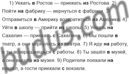 1) Уехать ... Ростов — приехать ... Ростова. 2) Пойти ... фабрику — вернуться ... фабрики. 3) Отправиться ... Америку возвратиться ... Америки. 4) Уйти ... школу — прийти ... школы. 5) Уехать ... Сахалин — приехать ... Сахалина. 6) Мы пошли ... театр, а они вернулись ... театра. 7) Я иду ... работу, а ты возвращаешься ... работы. 8) Ты зашёл ... музей, а она вышла ... музея. 9) Родители поехали ... вокзал, а гости приехали ... вокзала.