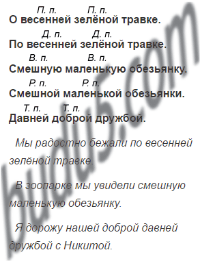 Объясним правильность написания окончаний прилагательных: Над широкой (Т. п., ж. р.) степью хищный (И. п., м. р.) коршун вьётся. Мальчик в беленькой (П. п., ж. р.) рубашке по селу идёт. По траве высокой (Д. п., ж. р.) кони на просторе бродят. В окнах сельской (Р. п., ж. р.) церкви огоньки мигают. Отец его занят домашней (Т. п., ж. р.) работой.