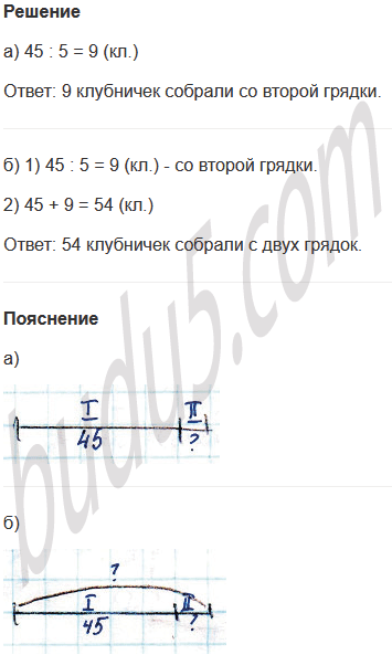 б) С первой грядки собрали 45 клубничек, а со второй - в 5 раз меньше. Сколько клубничек собрали с двух грядок?