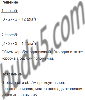 Задание № 4. Вычисли объём коробки с рёбрами 3 дм, 2 дм и 2 дм и двумя разными способами. Что ты замечаешь?