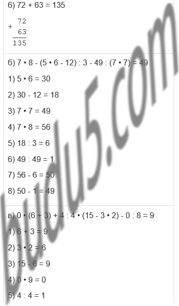 | в) 0 • (6 + 3) + 4 : 4 • (15 - 3 • 2) - 0 : 8 |