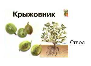 У взрослого кустарника – ствол, у молодого – стебель. У молодого зелёный цвет стебля. У взрослого кустарника ствол одеревеневший.