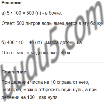 а) В бидон вмещается 5 литров воды, а в бочку - в 100 раз больше. Сколько литров воды вмещается в эту бочку?