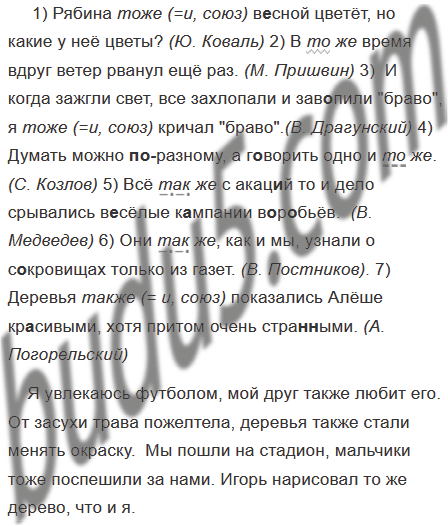 1) Рябина то(же) в..сной цветёт, но какие у неё цветы? (Ю. Коваль) 2) В то(же) время вдруг ветер рванул ещё раз. (М. Пришвин) 3) И когда зажгли свет, все захлопали и зав..пили "браво", я то(же) кричал "браво".(В. Драгунский) 4) Думать можно (по)разному, а г..ворить одно и то(же). (С. Козлов) 5) Всё так(же) с акац..й то и дело срывались в..сёлые к..мпании в..р..бьёв. (В. Медведев) 6) Они так(же), как и мы, узнали о с..кровищах только из газет. (В. Постников). 7) Деревья так(же) показались Алёше кр..сивыми, хотя притом очень стра(н, нн)ыми. (А. Погорельский)