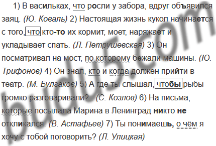 1) В вас..льках что р..сли у забора вдруг об(?)явился заяц. (Ю. Коваль) 2) Настоящая жизнь кукол начина..т(?)ся с того что кто(то) их кормит моет наряжа..т и укладывает спать. (Л. Петрушевская) 3) Он посматривал на мост по которому б..жали машины. (Ю. Трифонов) 4) Он знал кто и когда должен при. .ти в театр. (М. Булгаков) 5) А где ты слышал что(бы) рыбы громко разговаривали?.. (С. Козлов) 6) На письма которые посылала Марина в Ленинград (ни)кто (не)откл..кался. (В. Астафьев) 7) Ты пон..маеш(?) о чём я хочу с тобой поговорить? (Л. Улицкая)