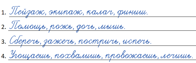 Пейза[ш], помо[щ'], сбере[ч'], угощае[ш], ро[ж], похвали[ш], экипа[ж], кала[ч'], заже[ч'], провожае[ш], фини[ш], до[ч'], постри[ч'], мы[ш], испе[ч'], лечи[ш].