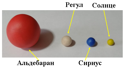 Вылепите из пластилина модели звёзд, изображённых на рисунке. Правильно покажите их форму, цвет и сравнительные размеры. Проверьте работу друг у друга.
