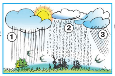 1. По этой картинке расскажите о дождях. К каким дождям подойдут названия: ливень, косохлёст, ситничек? Проверьте себя с. 87.