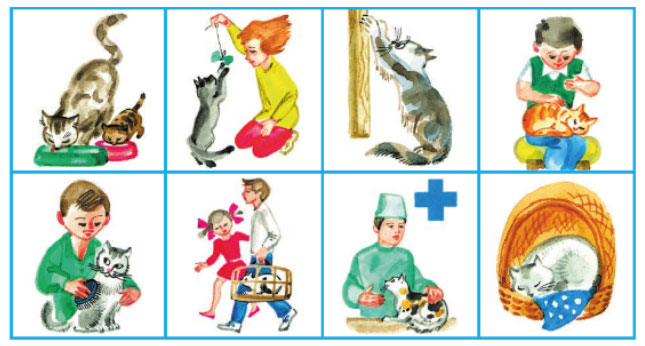 Вспомните, что необходимо для жизни любых животных. Какие условия нужны для жизни кошек и собак? С помощью рисунков учебника расскажите, как нужно ухаживать за кошкой и собакой.