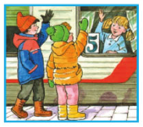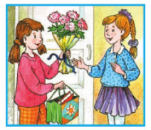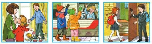 Рассмотрите рисунки. Придумайте диалоги между героями, используя слова: здравствуйте, спасибо, до свидания, извините, пожалуйста, благодарю.