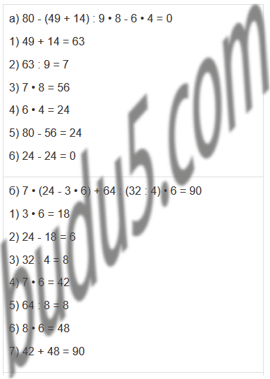 | а) 80 - (49 + 14) : 9 • 8 - 6 • 4 |