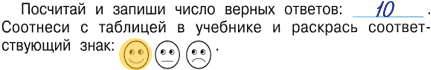 Выполняя задания учебника, заполняем таблицу. В столбце "Мой ответ" закрашиваем кружок в тот цвет, который, на наш взгляд, соответствует правильному ответу. В столбце "Правильный ответ" закрашиваем кружки так, как показано на "Страничках для самопроверки". Сравниваем эти два столбца и заполняем третий: если наш ответ правильный, ставим знак "+", если неправильный – знак "–".