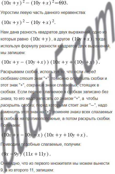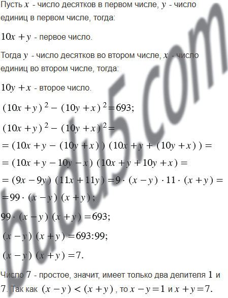 Разность квадратов двух двузначных чисел, записанных одними и теми же цифрами, равна 693. Найдите эти числа.