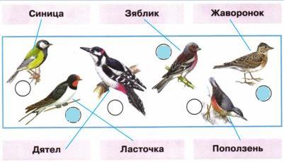Представьте, что эти птицы спорят, кому улетать в тёплые края, а кому оставаться. Помогите им принять решение. Отметьте перелётных птиц (закрасьте кружок).