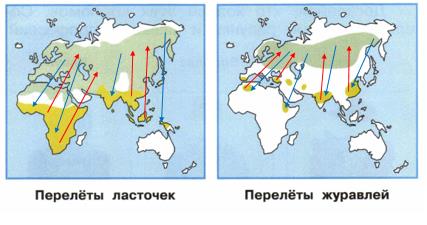 2. На этих схемах зелёным цветом показаны районы, где ласточки и журавли проводят лето. Жёлтым цветом показаны районы, где они зимуют. Обозначьте синими стрелками направление осенних перелётов ласточек и журавлей. Красными стрелками обозначьте направление из весенних перелётов.