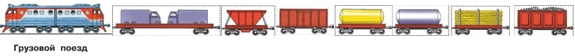 Товарный поезд перевозит автомобили, гравий, песок, бензин, древесину, товары.