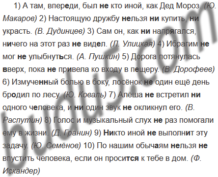 1) А там, впер..ди, был (не,ни)кто иной, как Дед Мороз. (Ю. Макаров) 2) Настоящую дружбу (не)льзя (не,ни)купить, (не,ни)украсть. (В. Дудинцев) 3) Сам он, как (не,ни)напр..гался, н..чего на этот раз (не,ни)вид..л. (Л. Улицкая) 4) Ибрагим (не,ни)мог (не,ни)улыбнут(?)ся. (А. Пушкин) 5) Дорога потянулась (в)верх, пока (не,ни)пр..вела ко входу в п..щеру. (В. Дорофеев) 6) Измуче(н, нн)ый болью в боку, лосёнок (не, ни)один ещё день бр..дил по лесу. (Ю. Коваль) 7) Алёша (не, ни)встретил (не, ни)одного ч..ловека, и (не, ни)один звук (не, ни )окликнул его. (В. Распутин) 8) Голос и музыкальный слух (не, ни)раз помогали ему в жизни. (Д. Гранин) 9) (Не, ни)кто иной (не, ни)выполн..т эту задачу. (Ю. Семёнов) 10) По нашим обыч..ям (не)льзя (не, ни)впустить человека, если он просит(?)ся к тебе в дом. (Ф. Искандер)