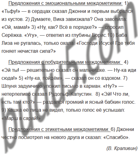 1) «Тьфу!» — в сердцах сказал Джонни и первым выбрался из кустов. 2) Думаете, Вика завизжала? Она завопила: «Ой, мама!» 3) «Ну, как? Всё в порядке?» — спросил Серёжка. «Угу», — ответил из глубины Борис. 4) «Эй ты! — решительно сказал он мальчишке. — Ну-ка иди сюда!» 5) «Ну-ка, пойдём», — сказал он со вздохом. 6) Джонни честно посмотрел на нового друга и сказал: «Спасибо». 7) Шпуня задумчиво уложил письмо в карман. «Ну?» — нетерпеливо сказал Рудольф Капустин. 8) «Эй! Что ли, есть там кто?» — раздался громкий и ясный бабкин голос. 9) Кашка её лица не видел, только голос её услышал: «Марш в сарай!» 10) Баба Лиза не ругалась, только охала: «Господи Исусе! Где тебя гоняет нечистая сила?»