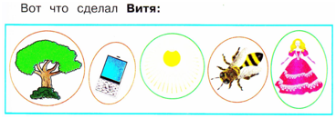 7. Даша, Витя и Олег получили задание: обвести на рисунке объекты природы зелёным карандашом, а предметы рукотворного мира – красным.